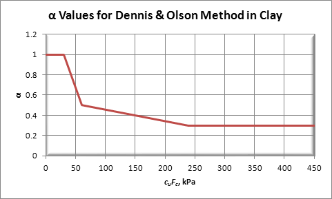 The correlation for α is similar in concept to the familiar API method, but is more conservative. The authors adopted the use of an α-method for simplicity. The authors note that the method was developed from data on normally or lightly overconsolidated clays and may not be applicable for other soil conditions.