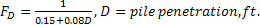 Turning to the pile toe, since the pile toe is in sand Equation 8 applies. For the toe, FD = 1/(0.15 + (0.08)(30)) = 0.39, σvo = 2400 psf and Nq = 8 (from Table 3.) Substituting,