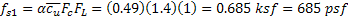 The unit shaft capacity for the clay layer is given by Equation 7. From the problem statement, Fc = 0.7, thus cuFc = (0.7)(2) = 1.4 ksf. Since 1.2 < cuFc < 5, α will have to be determined by linear interpolation. From Table 1, α = 0.49. Substituting these values, we have