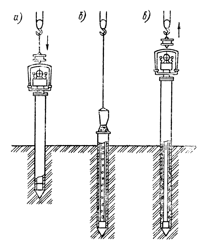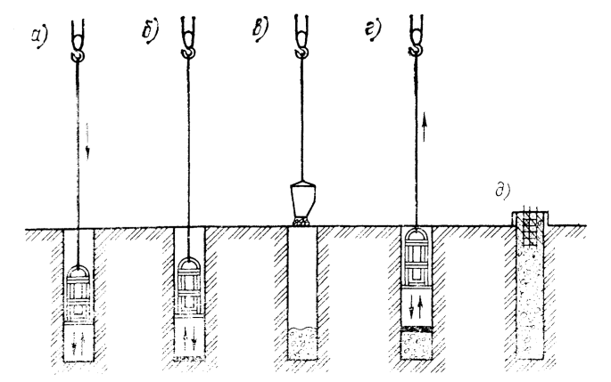 Stages of work on the production of filled piles with a vibrating grapple are shown in Figure 70. Vibrating grabs allow carry out excavations in the ground for the device supports of complex configuration in plan. Rectangular penetration in terms of production, in principle, there is no difference from drilling conventional shafts.