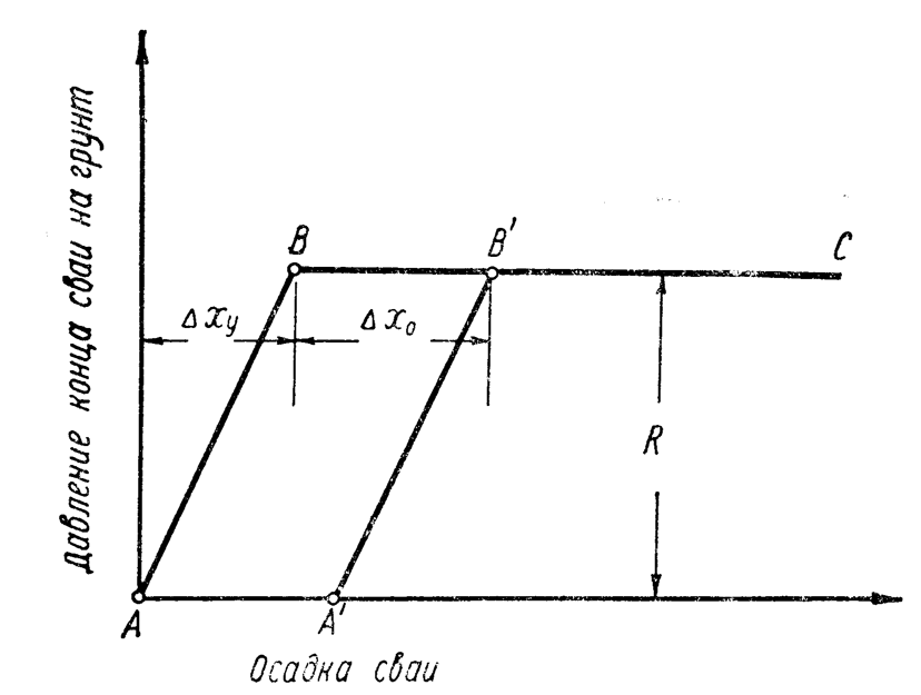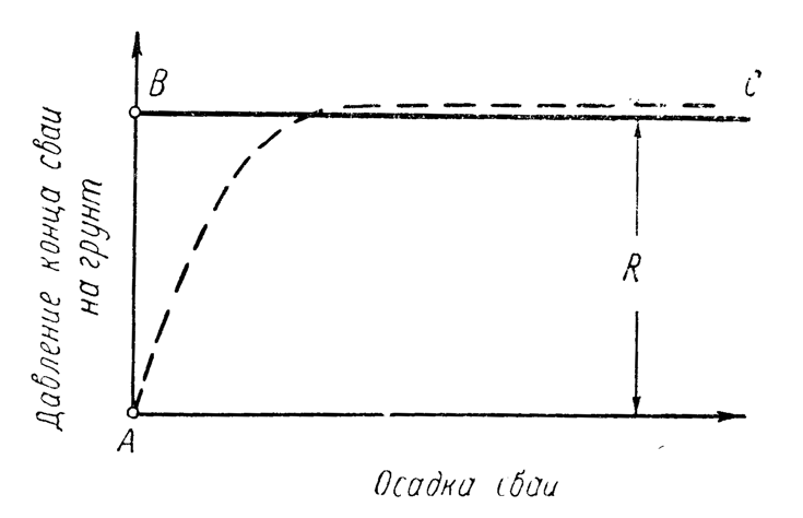 - the relationship between the toe resistance of the soil to the movement of the pile and its settlement is given in the form of a broken line ABC, shown in the graph (Figure 21), and it is assumed that the force R of this resistance does not depend on the speed of the pile; and