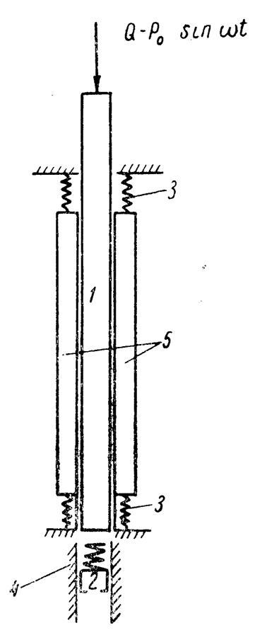 Thus, pile 1 (Figure 20) is affected by the force of gravity Q and the sinusoidal force of the vibrator . Overcoming the friction that develops along the side surfaces, the pile vibrates and hits the weightless plug 2, which falls if the force applied to it exceeds R. Yu. I. Neimark represents this force as dry friction of the plug against the fixed walls of the model. The values of T and R are assumed to be given and must be determined experimentally.