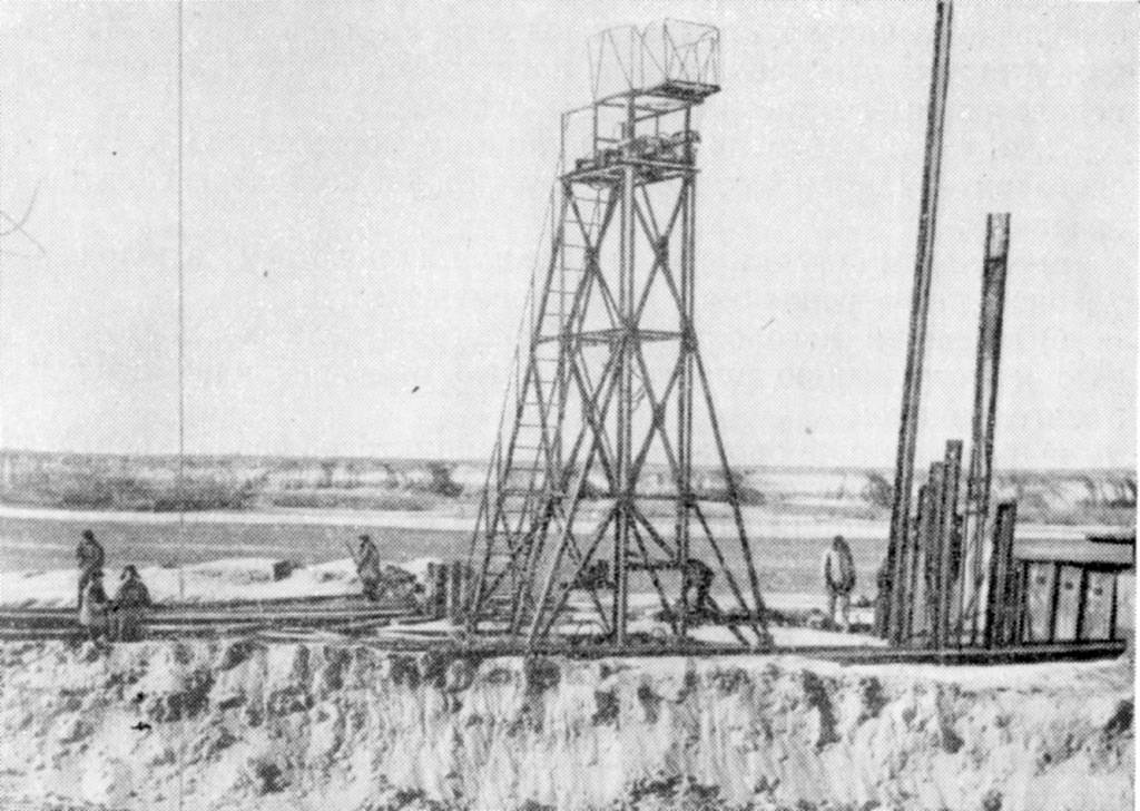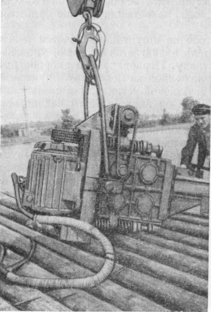 At Stalingradgidrostroy, during the development of the first samples of vibratory pile drivers, such as VPP-2, the crane operator V. G. Borisov for the first time applied a new sheet pile capture technique [25]. For this purpose, the crane boom was equipped with another cable, fixed at one end to an additional winch drum. There was a small hook at the other end. The sheet pile with its upper end was laid by a crane on a stand. The vibratory hammer suspended on a hook was brought up to the pile. At the signal of the crane operator, the worker threaded an additional hook into the hole in the lower part of the cap. Pulling the cable, the crane operator moved the vibratory pile driver to a horizontal position. With the help of the main and additional cables, he gave the vibratory driver a position in which the machine easily moved over the pile head.