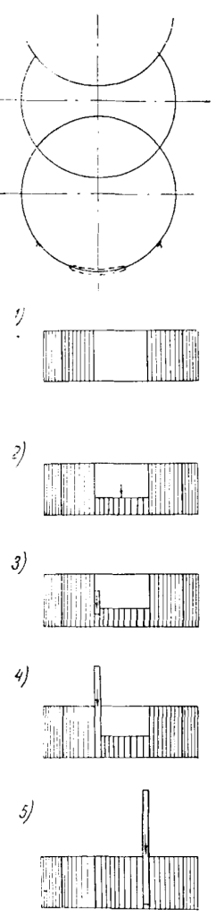 On the site of the Gorkovskaya and Kakhovskaya HPPs, one could see cylindrical templates – a through structure welded from rolled profiles, the outer outline of which corresponded to the shape and size of the sheet pile cells. At Gorkovgesstroy, the height of the templates was almost equal to the height of the sheet piling cells above the ground. At the construction of the Kakhovskaya HPP, low templates were made (Figure 75.) Two templates were installed in each cell – one on top of the other. The templates served at the same time as scaffolding, from which the sheet piles were loaded into the previously loaded lock and the vibratory driver was released.