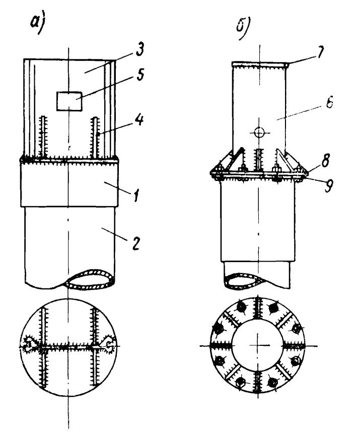 An adapter of a different design (Fig. 111b) is a section of steel pipe 6 with a diameter of 290 mm; a plug 7 and a flange 8 are welded to its upper and lower ends, with which the pipe section is connected to the flange 9 of the driving head 10, which is screwed onto the casing pipe.