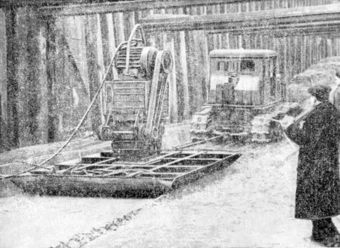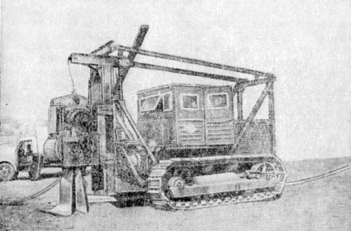 The experience of the Mechanization Department No. 19 is of interest. Trust No. 6 Glavmosstroy used the V-102 vibratory hammer to compact soil in road embankments. For these purposes, a self-propelled unit was designed (Fig. 121), consisting of a S-80 type tractor, a guide frame, a vibratory driver and a winch device for lifting and lowering it to the ground. The use of the unit gave positive results.