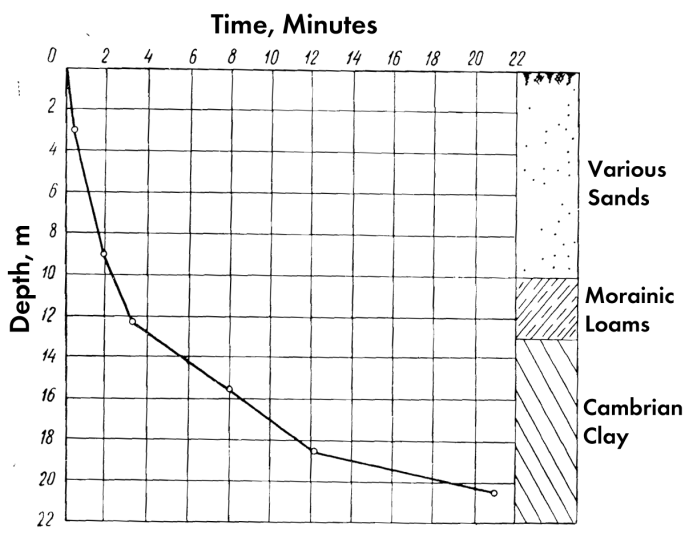 In Leningrad, an experimental immersion of steel pipes with an outer diameter of 33 mm was carried out at two sites. The soils of the first site consisted of the following strata, counting from the day surface: 0-10 m – various sands (fine-grained in the upper part of the strata, turning at the base into medium and coarse-grained with an admixture of pebbles); 10-13 m – moraine loams, dense, with a high content of pebbles, gravel and cobblestones; below 13 m – dense and heavy Cambrian clay.