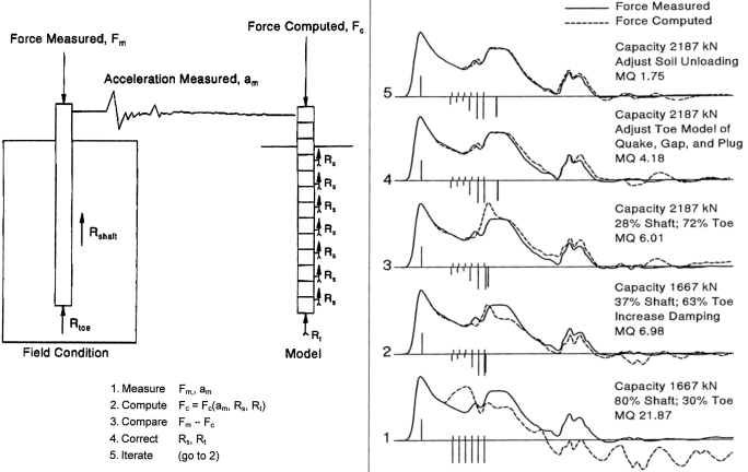 This is a complex topic that has kicked up a fair amount of discussion since its formal introduction in the early 1970’s (although work started on it in the late 1950’s.) The basic idea is that we start by instrumenting the pile at the head with strain gauges and accelerometers. With some processing we end up with two things: a force-time (and stress-time) history and a velocity-time history. We use these and, by the progressive application of what amounts to an optimisation/signal matching technique, end up with a distribution of resistance along the shaft and at the toe of the pile. This process is shown graphically below.