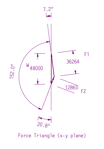 Since this is supposed to be a graphical solution, we’ll present the force triangle in the “tilted” x-y plane at the right. This represents the force summation at the top ring.