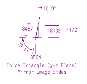 Now we turn to splitting the load between the two front and back slings of the right sling, which is the greater of the two. Since that load was assumed to be vertical, we also need to consider that the front and back slings are not in the x-y plane, and that too will add to the load. The diagram at the left shows half the load on each sling. The triangles remain even though the plane formed by the front and back slings is not parallel to any of the Cartesian planes.