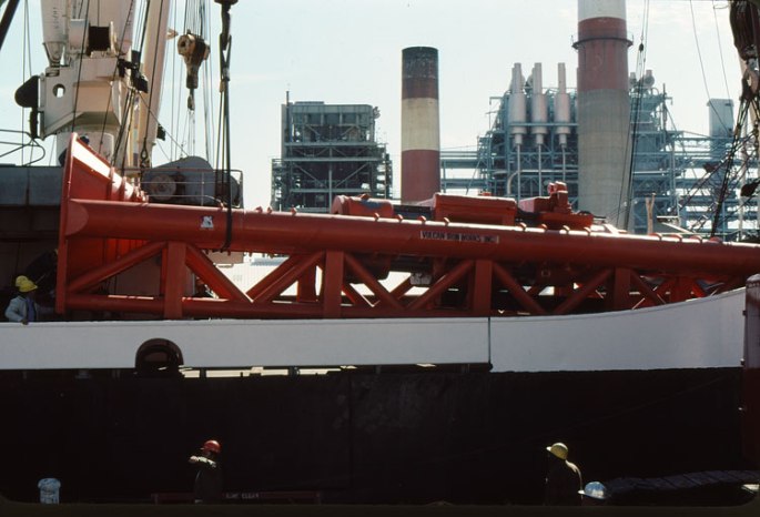 The years in Florida were exciting ones; they represented the years of the “Offshore Experience.” In addition to directing what was now an international company, the Florida plant built many of the leaders which guided these big hammers to drive the piles down. Below is a shot of one of them being shipped with the hammer from the Port of Palm Beach, Florida Power and Light’s plant being in the background.