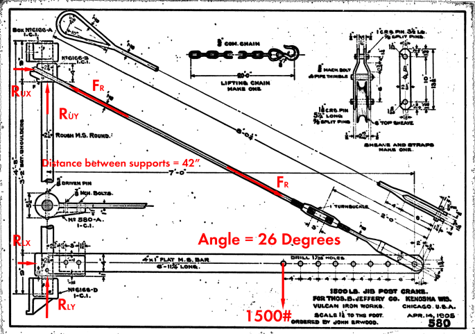 Strictly speaking, a two force member is a rigid body where the two forces are all a) on the same line of action and b) equal and opposite. To accomplish this we have to do something that isn’t really taught in contemporary statics courses: how to translate the physical reality of the device into the ideal supports we’re taught about, and whether that is entirely appropriate. (It’s a good assumption that Vulcan used a rigid body, ideal support approach when it designed this jib post crane.)
