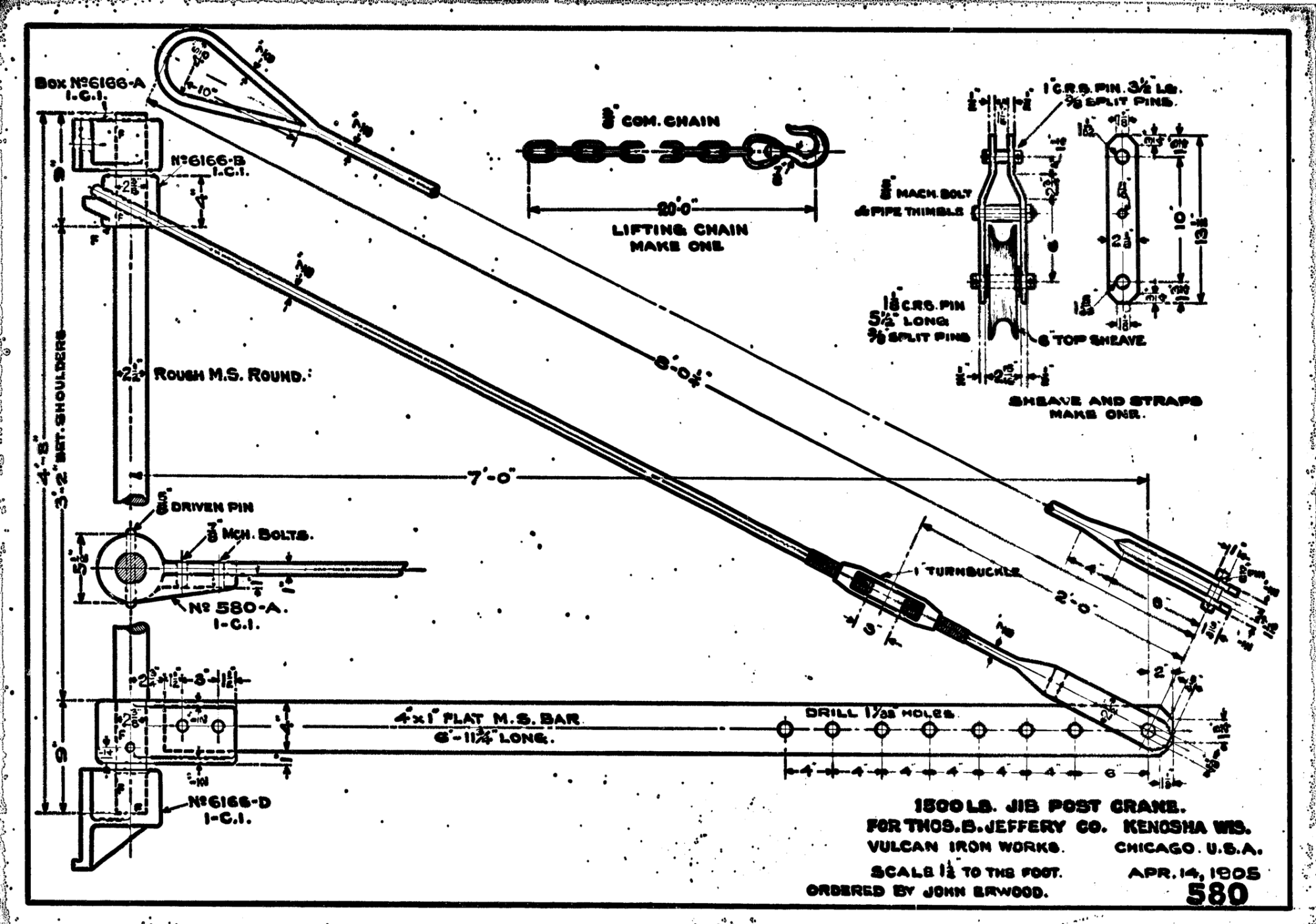 As this site has documented, Vulcan produced more than pile driving equipment, especially in the years before World War I. One of those is the 1500 lb. jib post crane depicted above, which Vulcan produced for the Thomas B. Jeffery Company in Kenosha, WI, an automobile manufacturer. (It ultimately became Nash motors, which in turn became American Motor Company before it was bought out by Chrysler.) The date on the drawing is 14 April 1905. It’s a simple device, one that finds its way into many machine shops including Vulcan. Vulcan made it a “turnkey” project including the sheave, lifting chain and wall brackets.