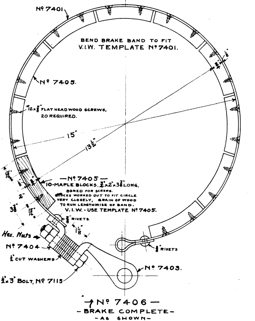 Turning to the brake shown above, it’s a fancier construction than many, with an outer steel band and a series of wood brake shoes screwed into the steel band. Let us assume that μ = 0.49. As far as the angle is concerned, a little inspection will reveal that there are ten (10) blocks and that, if the circle were closed, there would be twelve blocks, thus α = (10/12)(360) = 300 degrees = 5.24 radians (which are necessary for Equation (2)). Inserting these values into Equation (1) shows that