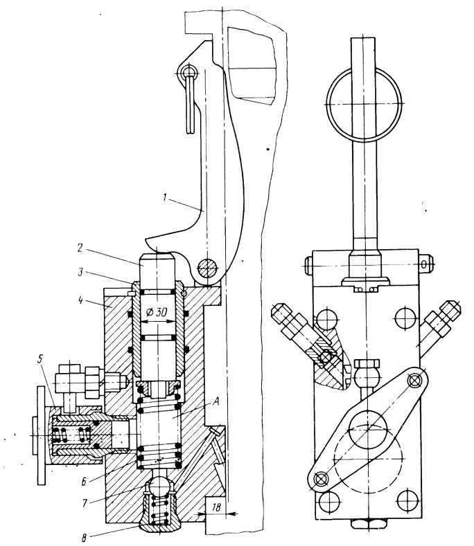 The cylindrical projection of the housing 4 with a nozzle hole enters the recess of the diesel hammer cylinder and directs the fuel stream to the center of the anvil. The housing contains: bushing 3, return spring 6 and plunger 2. Lever 1 is installed in the lugs of housing 4; a valve with a ball 7 and spring 8 is installed in the lower part of the housing. When fuel is supplied by the pump, the valve opens and blocks the access of gas to the pump cavity. When turning the adjusting lever 5 clockwise, the amount of fuel supplied to the combustion chamber decreases, counterclockwise – increases. The adjusting lever rotates with the help of two ropes attached to the holes of the lever.