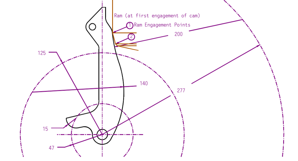 - Engagement point 1 is the only contact that the ram has with the 140 mm radius of the cam; this is the single longest phase until the full rotation of the cam is achieved and the ram’s straight side holds the cam back in place until upstroke reverses the process and the cam rotates clockwise to its original position.