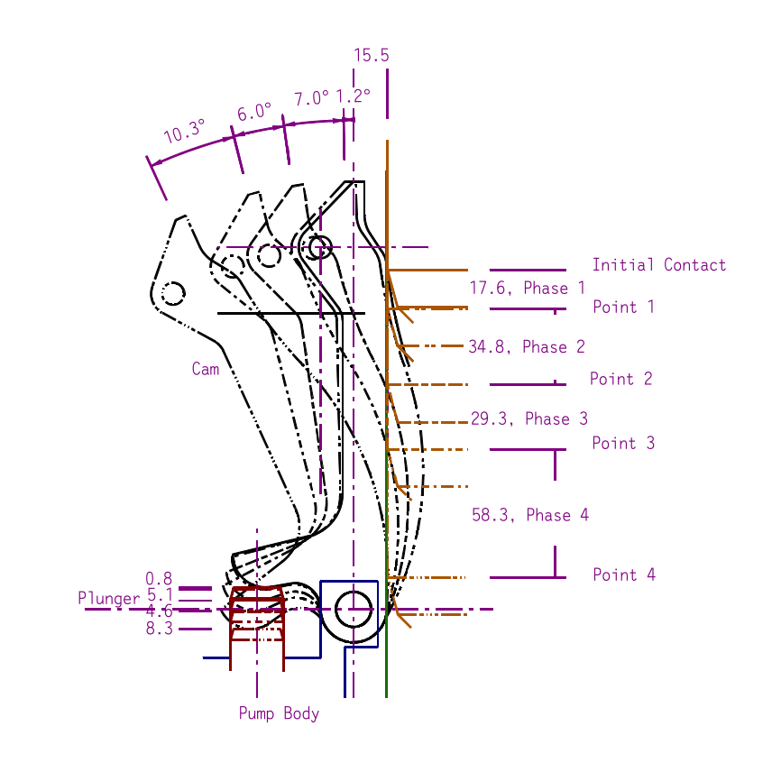 - The nominal stroke of the cam is 16 mm, which is smaller than the stroke indicated by the geometry of 18.8 mm. This is necessary to compensate for wear and other variations in the configuration of the fuel pump and cam.