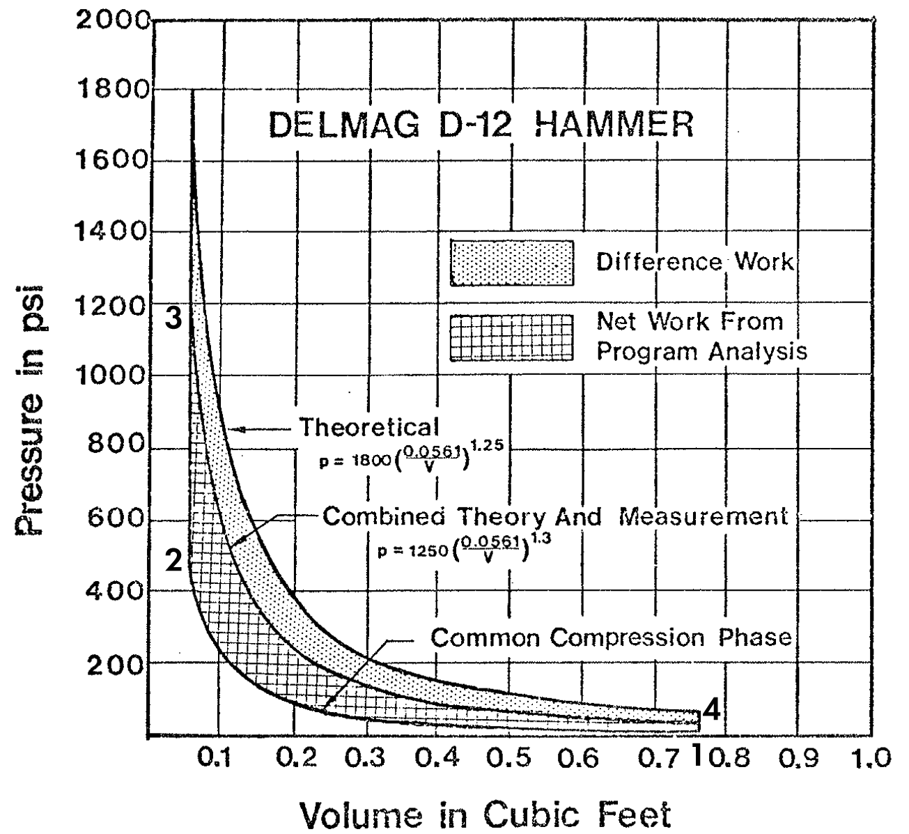 Although we call these diesel hammers, and that’s certainly the case because of a) they are compression ignition engines and b) use diesel fuel, the thermodynamic cycle is in reality an Otto Cycle. (The familiar diesel hammer cycle can be found in both the Nilens and Russian Diesel Hammers posts.) This is illustrated in a figure from this document, produced in the early years of the development of the wave equation program: