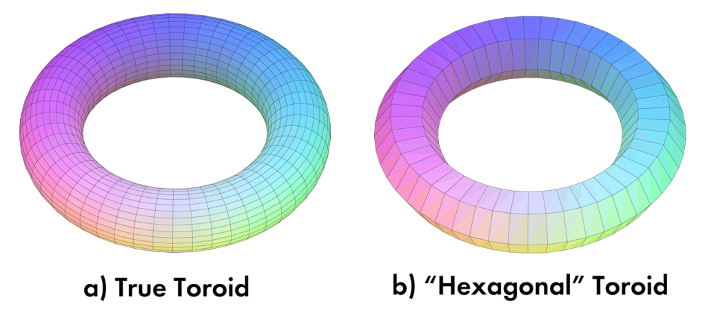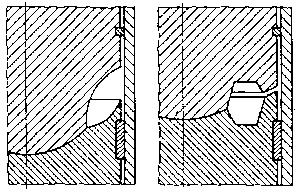 As sort of a hat tip to the idea of reducing the area/volume ratio, there is evidence that the design began using a true toroid (circular cross-section) and only later went to the hexagonal cross-section shown in Figure 4.11. The difference between the two is illustrated below. Generally half of the cross-section was in the anvil and half in the ram so that the fuel, when impact atomisation took place, would be in the centre of the combustion chamber and the progress of the combustion would, in theory at least, start in the middle and progress outward to the walls. (The same concept, btw, applies to conventional combustion chamber, it just requires a smaller/steeper radius to make it happen.)