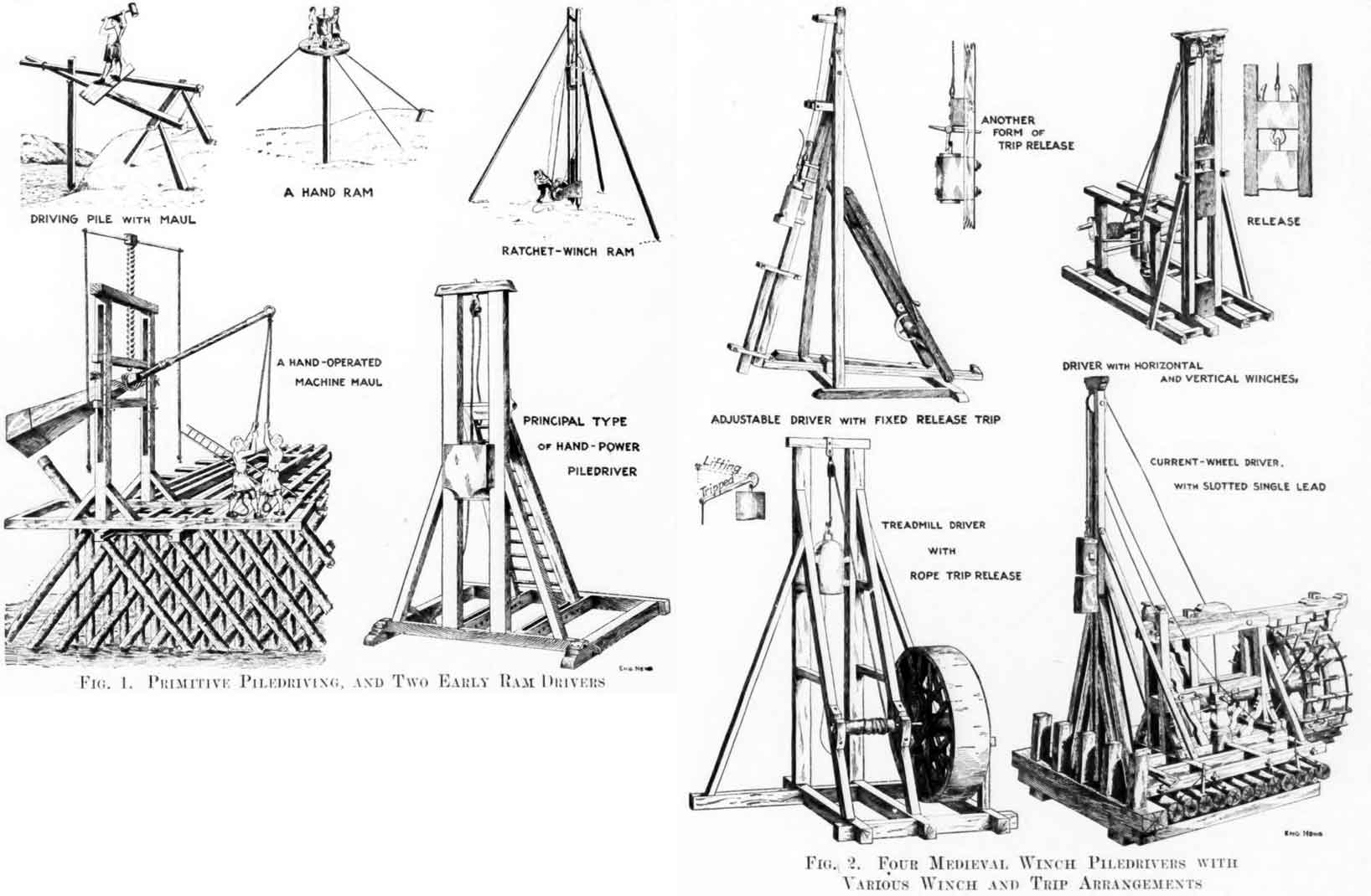The three sketches just referred to are from a medieval work on construction. Probably they represent devices which even then were only of historical importance, for the same work sketches the machine piledriving ram at top right in Fig. 1. Here the essential elements of the piledriving machine are present: a pair of leads, a ram moving between them, a hoist rope led over a pulley at the top, and a winch for hoisting. In this case ratchet winch is used, so that one man can lift the rail. It is not apparent how the ram was released; possibly it was released simply by throwing out the ratchet pawl.