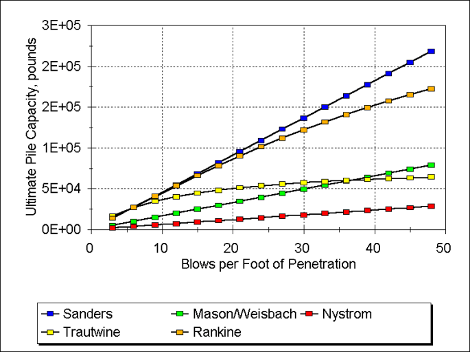 Figure 21 shows “bearing graph” results for a variety of formulae. It should be noted that the x-axis is set per blow and not blows per foot. (This kind of plot also appears in Isaacs.) It should be compared with the bearing graph developed for the Proctorsville project, which is shown below Figure 21. In both cases it is evident that the results of the dynamic formulae vary considerably from each other and that the EN (Wellington’s) formula has mainly succeeded in adding to the confusion.