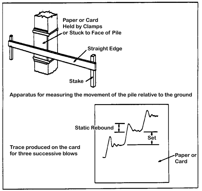 The dynamic formulae had one unarguable result: they established mathematically that there was some kind of relationship between the blow count/set of a pile and its soil resistance to driving (SRD.) This meant that it was imperative for the blow count to be recorded during installation. One simple way of doing this was to paint marks on a pile at definite distances between them and then count the number of blows it took to get from one mark to the next. This simple method even went offshore, long after the length of the piles obviated any residual validity that the dynamic formulae might have. This can be seen in the photo on the right.