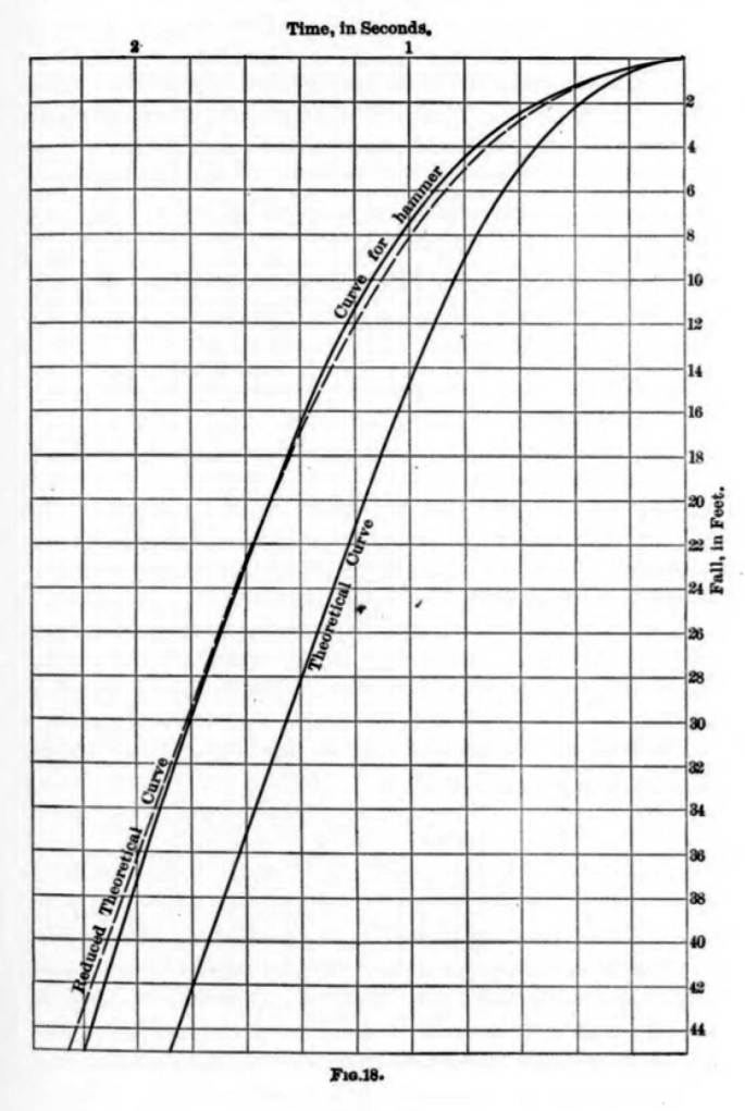 The apparent quality of Goodrich’s results improves—in part because the displacements are larger and thus easier to measure—when he takes on the issue of the energy losses during the fall of the ram. Goodrich pithily notes that “Few authors seem to think that the actual velocity with which the hammer falls differs materially from its theoretical value.” His experiment—the first that I am aware of which measured the efficiency of an impact pile hammer—showed that this was erroneous.