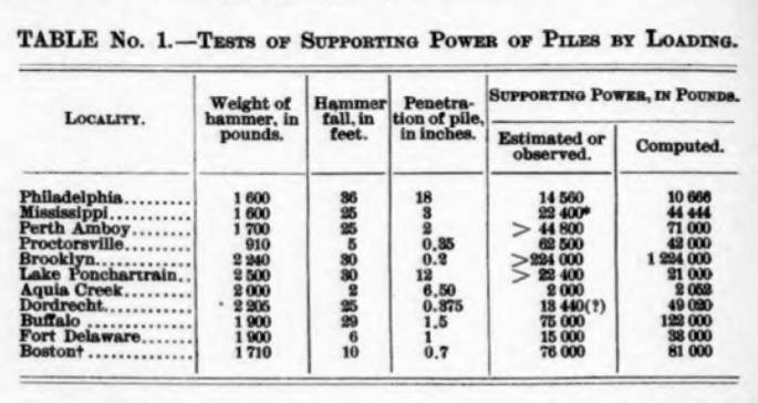He makes some comparison with earlier formulae and especially Trautwine’s, and claims his is closer than that Trautwine’s in seven out of eleven cases. Going into this study, it is fair to say that Trautwine’s formula was probably the best dynamic formula available; its displacement by the EN (Wellington’s) was not an advance for driven piles.