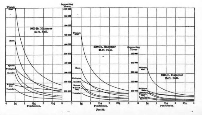 An instructive experiment, throwing some light on the nature of the support given to a pile by the earth into which it is driven, is to take a box with a glass front, fill it with lightly compacted sand, and push down between the glass and the earth half-round sticks, similar to piles in shape. This experiment discloses the fact that a compact cone of earth is formed under the foot of a blunt stick, and remains there, being pushed forward through the ground as the stick descends. This cone acts exactly like the sharp end of a pointed stick or pile. It will always form under any load which soil is required to carry, and, consequently, the bearing power of the latter is one of the latter is one of the elements helping in the support of a loaded pile.