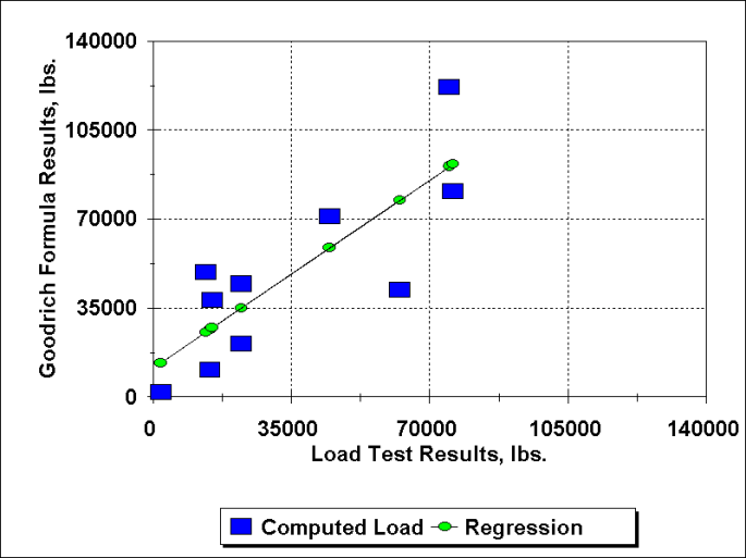 In the course of his analysis Goodrich derived yet another formula, which he compared with a series of projects which, in some cases, dated back half a century. He compares those to the load tests that were run and those results are shown in Table 1.