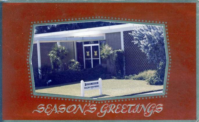 It's a little late, but this, the 1971 Christmas card from Vulcan Iron Works. Above shows the Australian Avenue office; below is the greeting: