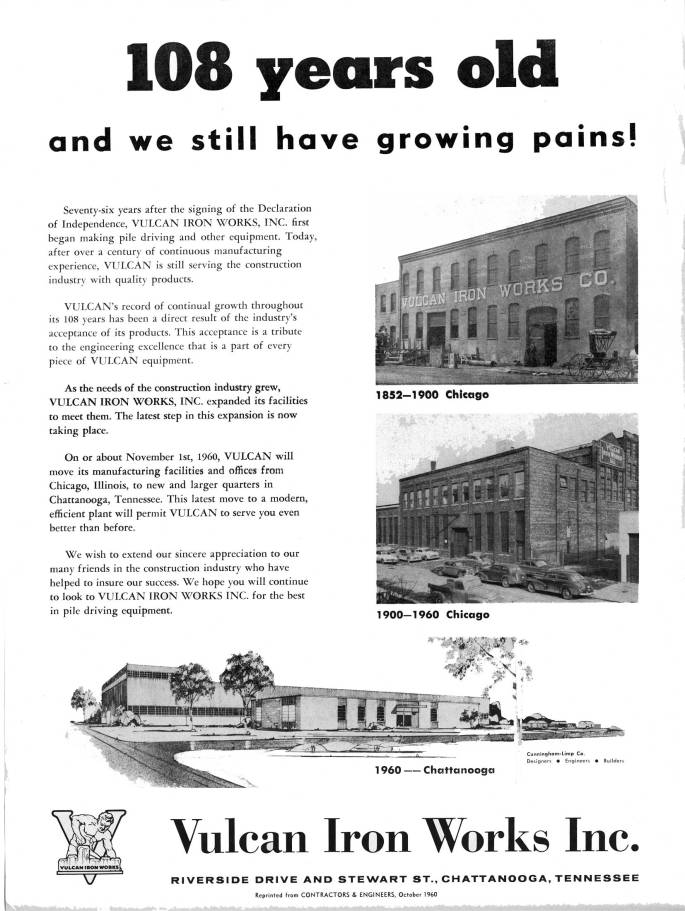 In the midst of all that's going on these days, one anniversary (for this site at least) doesn't need to pass unmentioned: this month sixty years ago, Vulcan moved its operation from Chicago to Chattanooga, after 108 years in the "Windy City." Everything around the operation went according to plan, from the plant construction to … Continue reading Sixty Years of Vulcan in Chattanooga