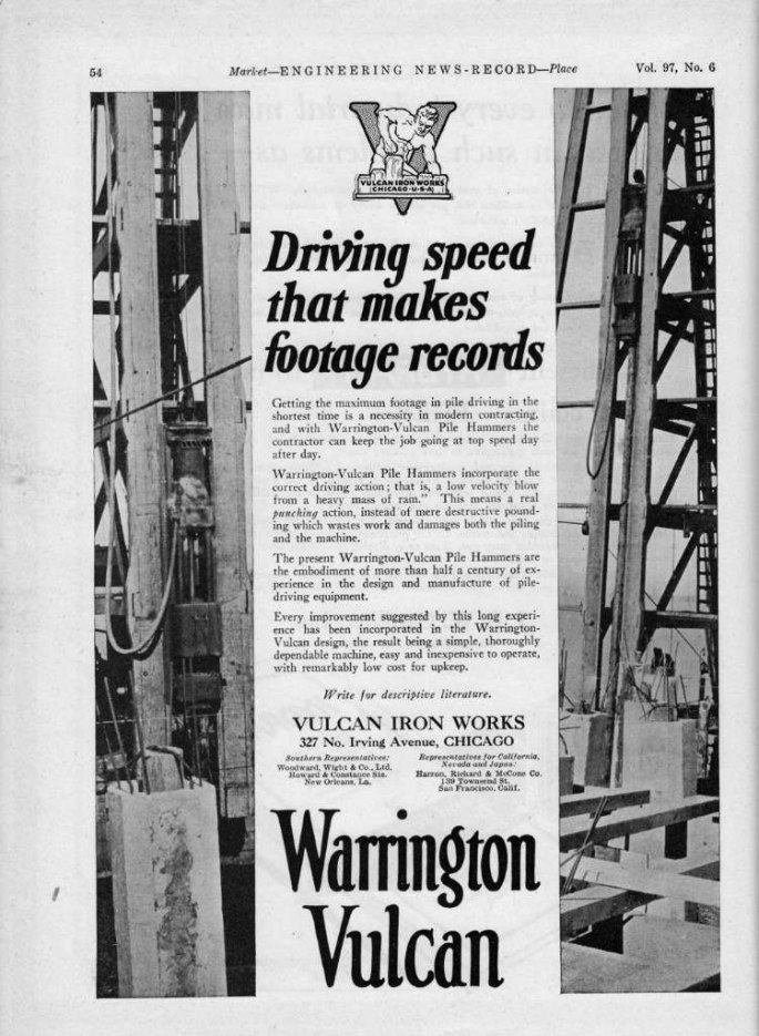 Above, an ad for the Warrington-Vulcan hammer, as featured in Engineering News-Record, 1926. Note that there are two distributors listed: one in California and the venerable Woodard Wight in New Orleans, which (with its salesman Herman Hasenkampf) went on to represent Vulcan in the Gulf during the offshore years. Note also that Vulcan even at … Continue reading Driving Speed That Makes Footage Records