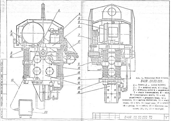 In 1988 Vulcan personnel visited what was then Leningrad to view the operation of a Soviet variable-eccentric moment vibratory hammer. The account of that is here. This is the field service manual for the hammer. A closeup of the exciter and suspension, clamped to the pile. As is common in Europe, the sheets are picked … Continue reading Field Service Manual for Soviet B402/V402 Vibratory Hammer