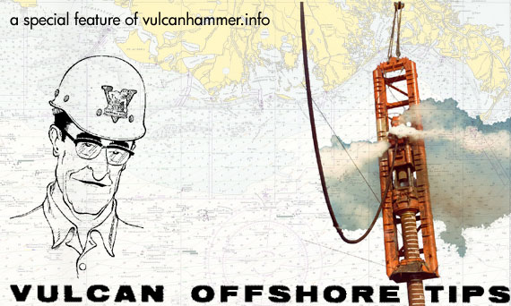 Below are listed the center axial centers of gravity for Vulcan Offshore Hammers. HAMMER SIZE CENTER OF GRAVITY Inches 020 73.0 030 84.0 340 93.0 530 99.0 360 94.0 540 108.0 3100 118.0 560 109.0 5100 131.0 5150 124.0 4250 129.0 6300 140.0 Note: Tip dated 1 August 1980. Some Vulcan sales people also carried … Continue reading Vulcan Offshore Tip #22: Hammer Center of Gravity