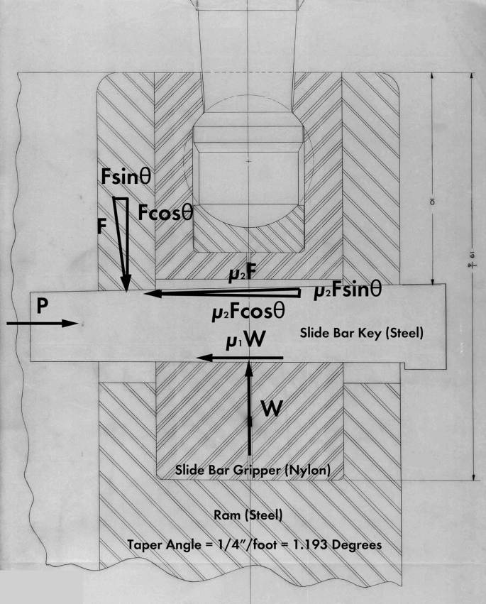 In the earlier post Tapered Keys and Their Use In Vulcan Hammers we had a general discussion of tapered keys, the theory behind them and their application in Vulcan hammers. In this post we'll look at one specific application--the Vulcan 560 Slide Bar Key--and see how Coulombic friction applies in this case of a self-locking (hopefully) … Continue reading An Example of a Self-Locking Wedge: the Vulcan 560 Slide Bar Key